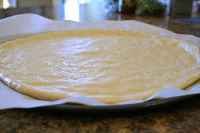 In a large mixing bowl, preferably that of a stand mixer, stir yeast and honey into warm water. Sit for 5-10 minutes or until bubbles form and mixture starts to foam. This tells you that the yeast is alive and kicking. Pour in salt, oil and half the flour and mix. Once that flour is incorporated, start adding flour in bit by bit until you get the pizza dough to the consistency you want: slightly tacky, but when you touch it it doesn't stick to your hands. Once you reach this stage, knead for 6 minutes. Turn a timer on and walk away! The dough should be smooth and easy to work with. And the bowl should be clean! Lightly grease the bowl & the dough so it doesn't dry out, cover with plastic wrap and let it rise 1-2 hours.