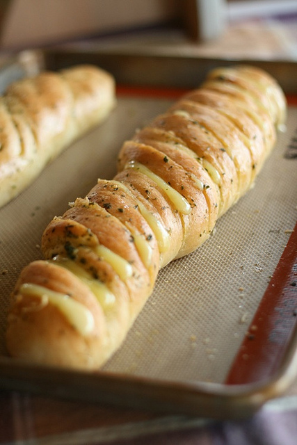 Cut 1-inch slices 3/4 s of the the way through the loaves. Brush garlic butter in between each slice and fill with a slice of cheese. Bake another 3-5 minutes or until cheese is completely melted.