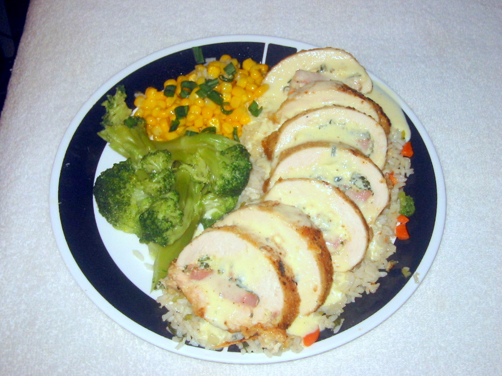 Pound chicken breasts thinly and evenly as possible. Season with salt and pepper. Place one slice of ham on each, followed by the cheese, cooked bacon strip, and about 2 tablespoons of the spinach mixturee, Sprinkle with the parmesan cheese.