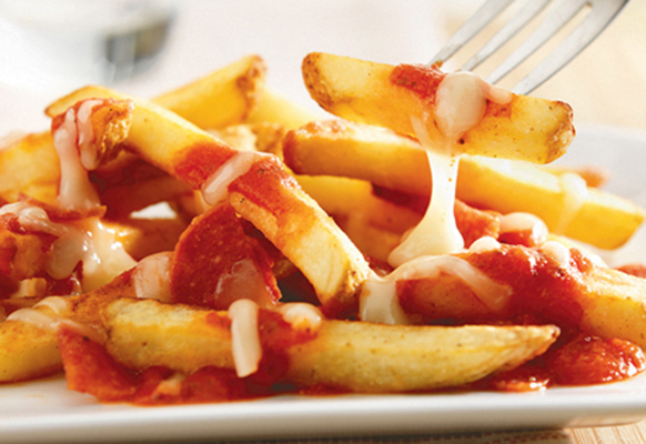 Prepare the fries according to the package directions. Remove them from the oven. Pour the sauce over the fries.