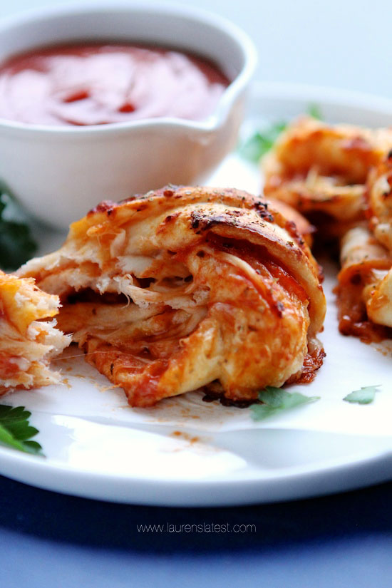Fold the other half of dough overtop of the pepperoni and cheese and press around edges to seal. Cut into 8 even strips.