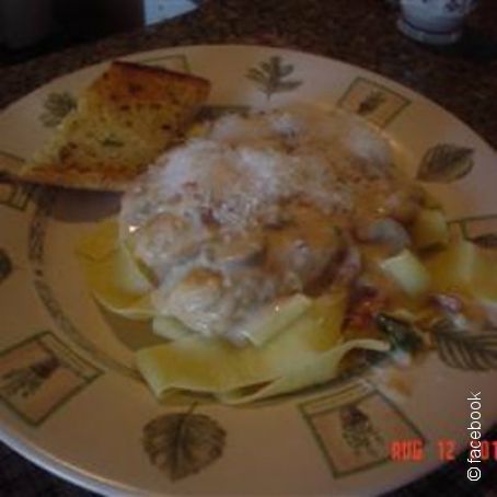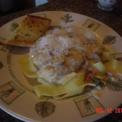 Pour the cooked egg noodles into the saucepan, and toss with the cream sauce. Divide noodles onto 4 serving plates, and top with grilled chicken. Garnish each serving with a cilantro sprig and the juice of 1/4 lime.