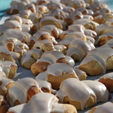 Cool thoroughly and top with a glaze made with icing sugar, melted butter and milk mixed together in a small bowl. Before glaze sets. Sprinkle tops with almonds.