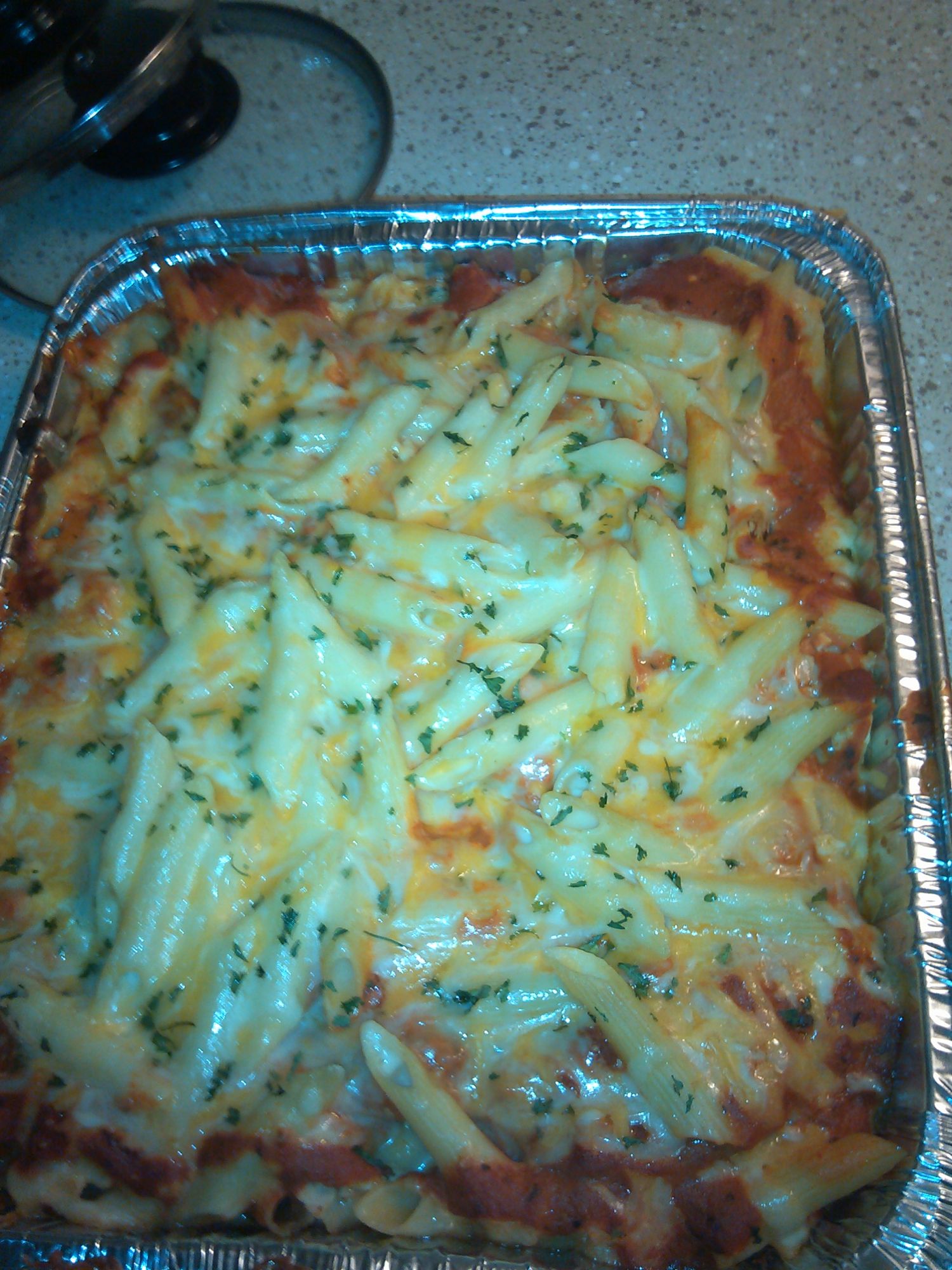 - 16 oz box of Ziti noodles 1 pack of boneless chicken breast 1 box of college inn chicken broth 2 cans of tomato sauce 1 jar of sour cream 1 box of cream cheese a pinch of salt and pepper olive oil mozzarella cheese oregano basil thyme garlic