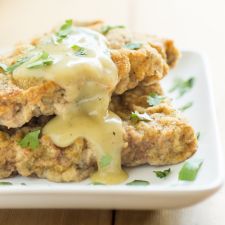 Pound steak and cut into serving pieces. Mix together eggs and milk. Dip meat into wet ingredients, then into the cracker crumbles. Brown both sides before cooking over low heat for 45 to 60 minutes.