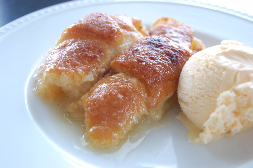 In a bowl, melt your butter and stir in sugar and vanilla. Mixture will remain grainy. Pour over top of the crescent wrapped apples.