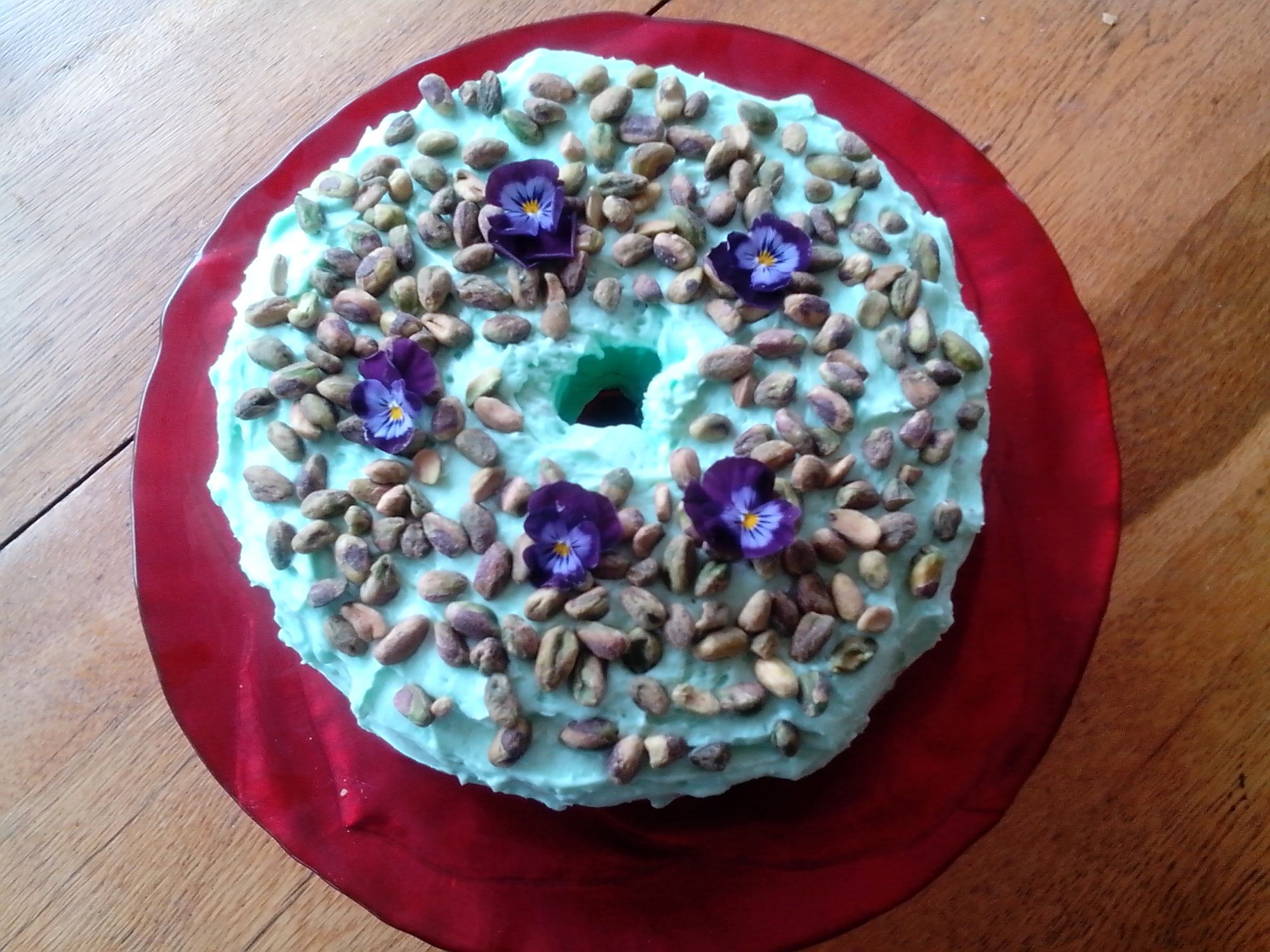 Great spring cake. Sprinkle top with pistachio nuts and violets.