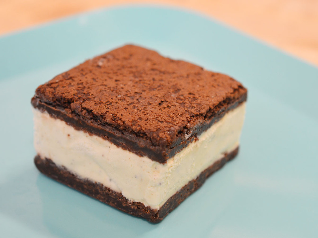 Using the paper overhang, gently lift the cake onto a cutting board. With a serrated knife, cut the cake in half crosswise. Place one half of the cake, top side down, on a large piece of plastic wrap. Spread with the softened ice cream, smoothing with an offset spatula. Top with the remaining half of cake, top side up. Place the assembled dessert back into the baking pan and wrap tightly in plastic wrap. Place in the freezer until firm, about two hours or overnight.
