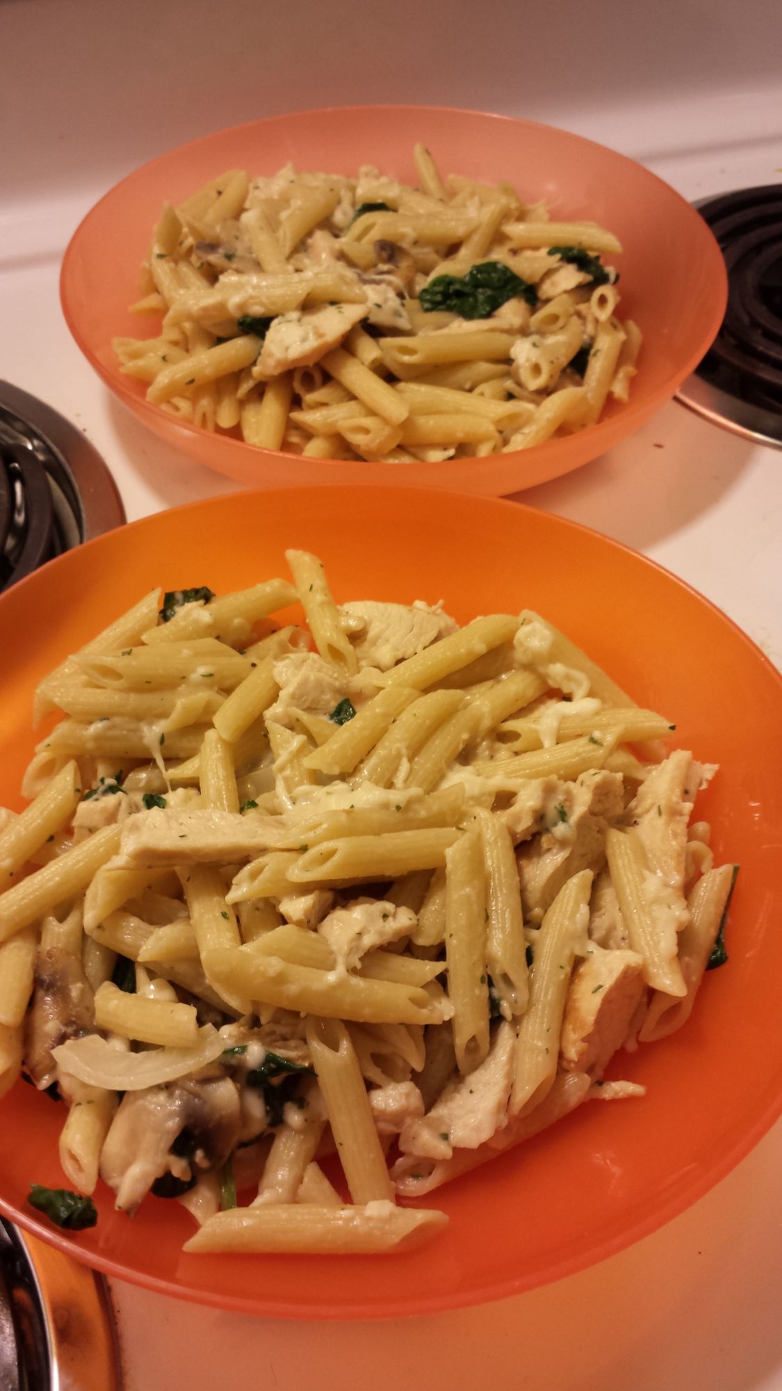 Boil water. In skillet, put chicken breasts with 1 tbsp olive oil. Squeeze lemon over chicken and lightly salt. Cook 4-6 minutes on each side over medium to high heat. In another skillet, saute onions in 1 tbsp olive oil over medium heat. Add mushrooms and garlic. Add pasta to water, and slice chicken once cooked. In pot, add spinach and water over medium to high heat until soft. Add chicken to other skillet. Add half & half. Strain noodles and spinach and combine into pot. Add cooked ingredients to noodles and spinach on low heat. Mix in herbs and cheeses. Stir well for 3-5 minutes.