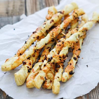 Using a sharp knife, slice the puff pastry crosswise into 1/2-inch-wide strips. Twist each strip into a spiral and transfer to the parchment-lined pans. Be sure to leave about 1 inch of space between each strip.