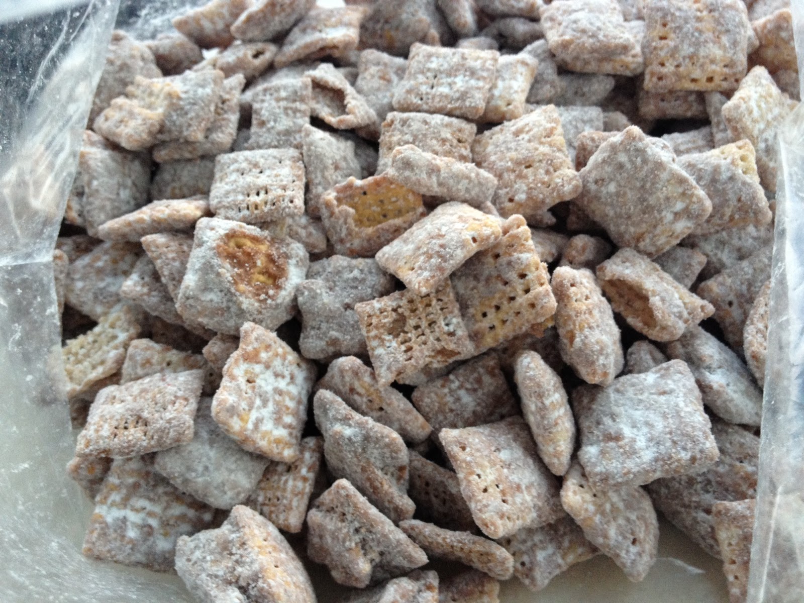 Pour mixture into large Ziploc bag and add powdered sugar.