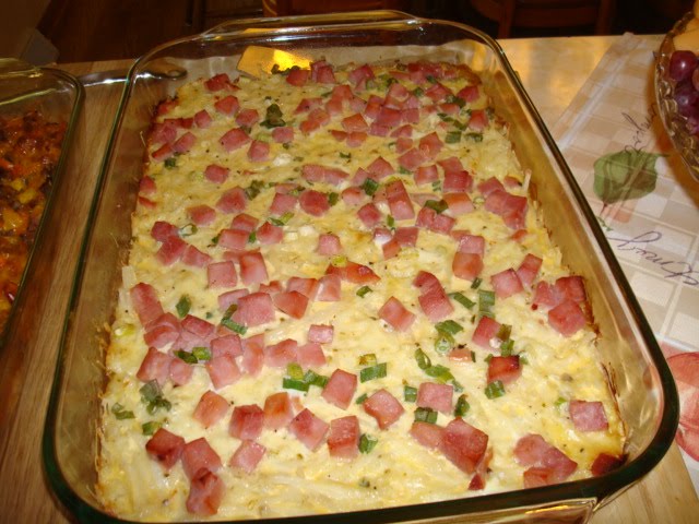 Brown hash browns and then arrange evenly in the bottom of the a 9x13 baking dish. Sprinkle with cheese, ham, and green onion. In a large mixing bowl, combine eggs, sour cream, salt and pepper. Pour egg mixture over potato mixture in dish. Bake at 350 45-55 min.