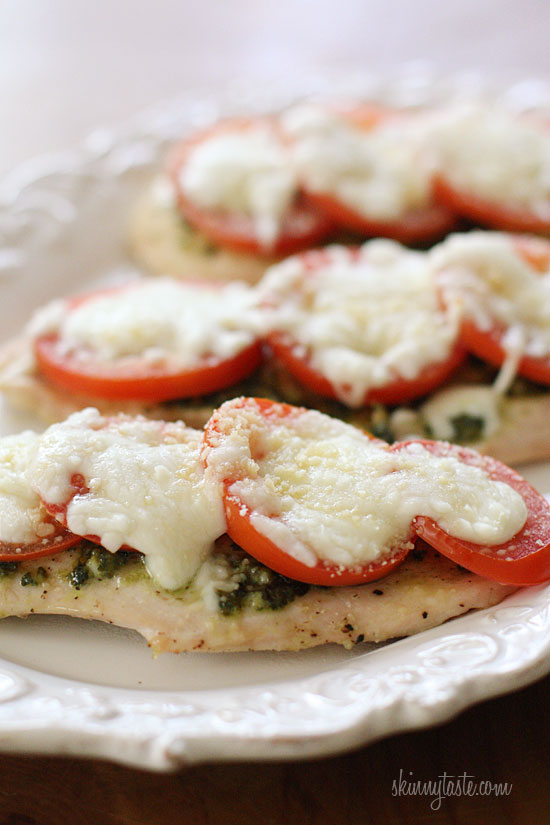 Place the chicken on prepared baking sheet. Spread 1 tsp of skinny pesto over each piece of chicken.