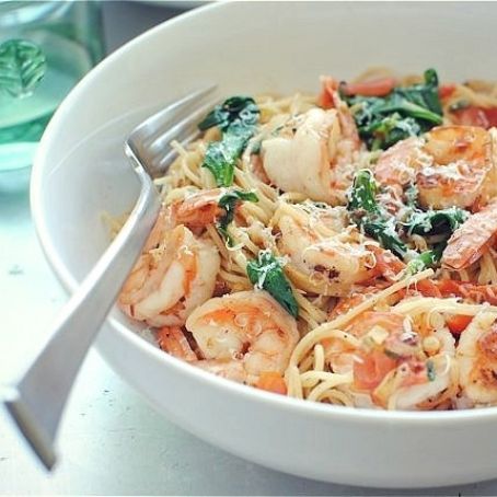 Angel hair pasta with shrimp, chili and tomatoes. Discover our recipe.