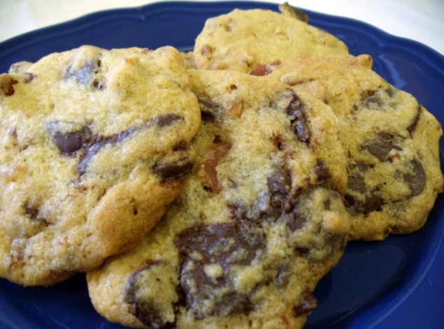 3 In a large bowl: Cream together the bacon grease, margarine, butter and sugars. Add the eggs, vinegar and vanilla. Slowly add in the flour mixture, when dough is done, fold in the bacon, nuts and chocolate chips. Refrigerate dough in covered bowl for 3 hours minimum (I do mine over night).