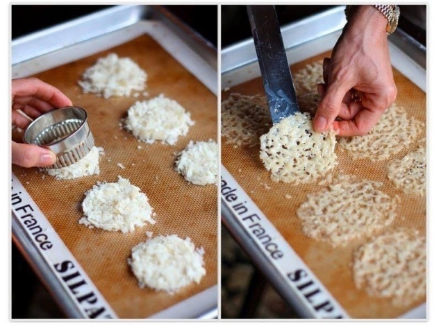 Line a large baking sheet with a Silpat. You can use parchment paper, if you do not have a Silpat. Take a 2.5 inch biscuit cutter and place about 2 tablespoons of the cheese into the cutter. Press down a little on the cheese, to shape. Gently remove cutter. Repeat until you have made 8 mounds of cheese. If you like, add a little pinch of black pepper on top of each one. Bake for about 7-8 minutes, just until set and before they start to turn golden. Remove from oven, let cool on pan for a few minutes. They will firm up as they cool. Gently lift off with a spatula.