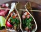 shredded chicken served in a soft fried corn tortilla with monteray cheese rolled together and topped with a chile verde sauce over the top.