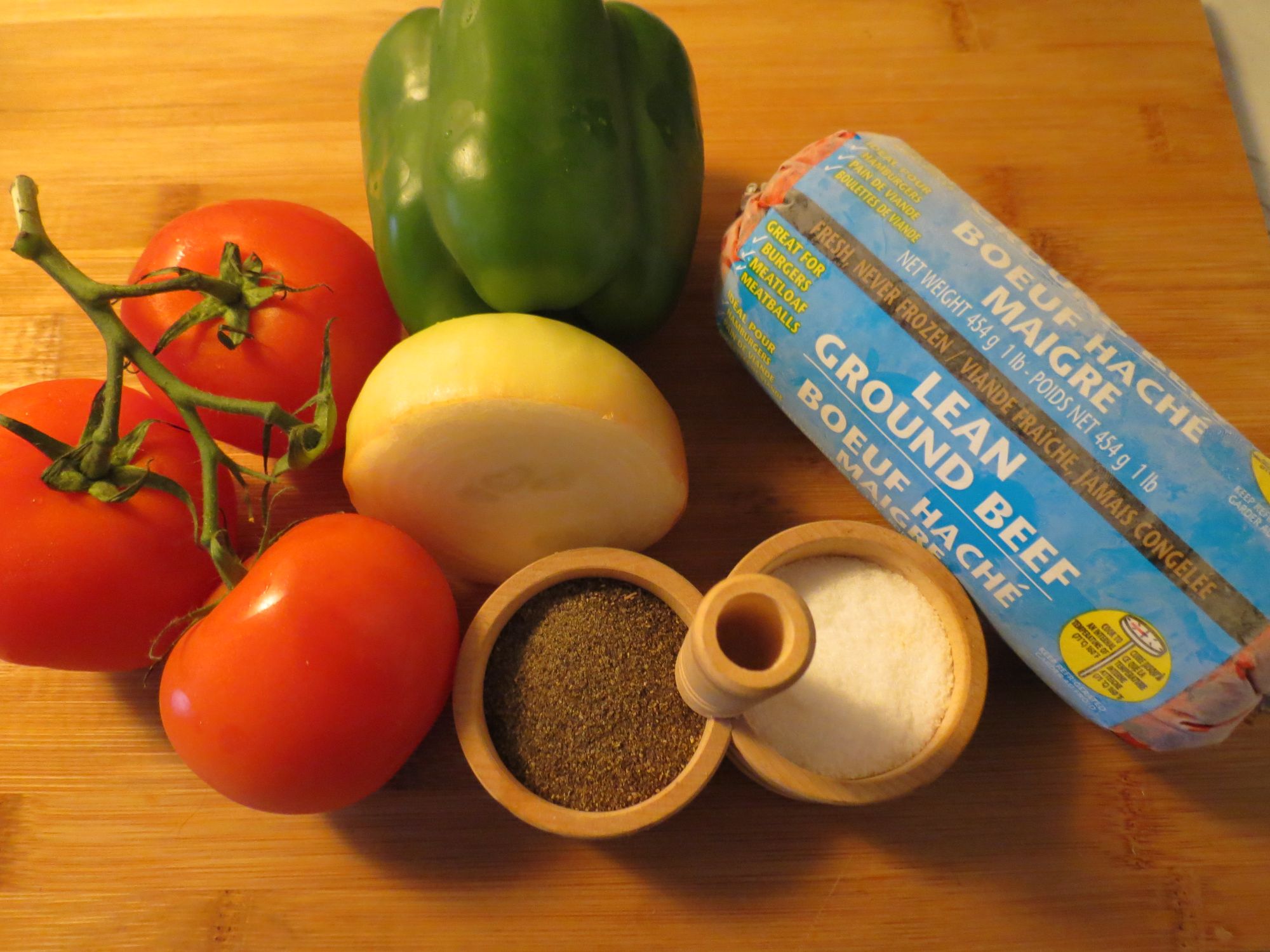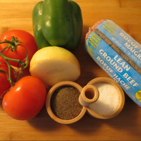Clean inside of green peppers and rim with garlic. Fill with the meat mixture. turn rest into small balls. Cook 45 min in water covering 3/4 of peppers height. Once cooked, set aside and take out the peppers and meat balls.