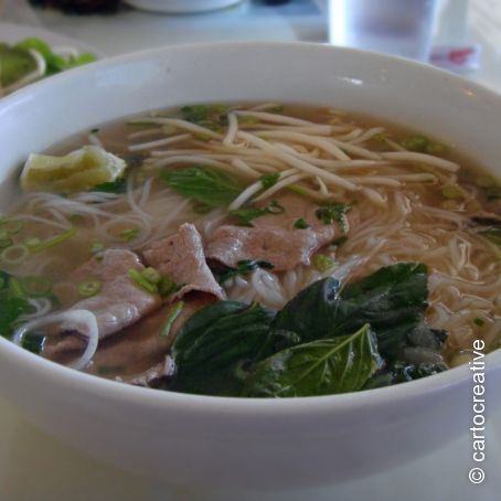 Place rice noodles in large bowl filled with room temperature water and allow to soak for 1 hour. Bring a large pot of water to a boil and after noodles have soaked, place them in the boiling water for 1 min. Bring stock to a simmer.