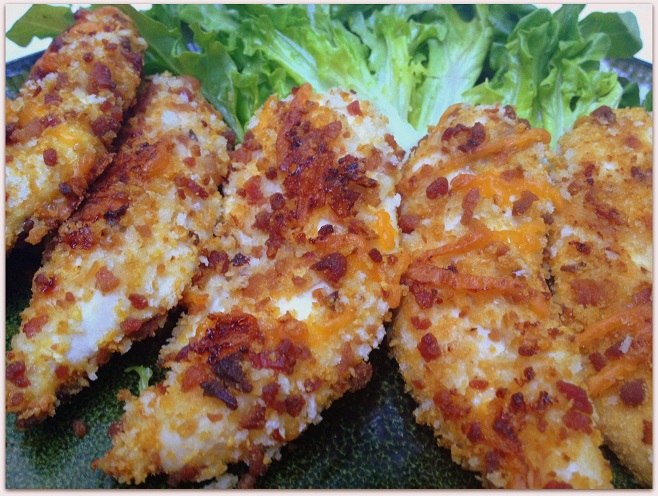 In shallow bowl, beat egg. In large resealable food-storage plastic bag, place bread crumbs, cheese and bacon. Dip chicken into egg. Place in bread crumb bag; seal and shake to coat. Place chicken on cookie sheet.