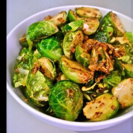 Pre-heat oven to 400F. In a medium-sized greased baking dish place cut Brussels sprouts. Set aside. In a small bowl mix together all other ingredients until fully combined. Pour mustard mixture over Brussels sprouts and toss until fully covered. Cover baking dish with foil and bake for 10 minutes covered and then 5 minutes uncovered. Serve warm and fresh.