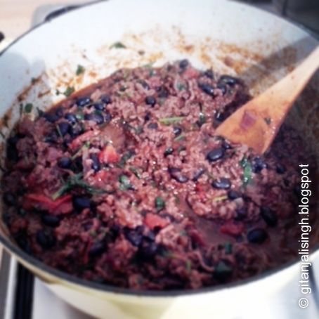 Add the spices to the meat, along with a dash of Worcestershire sauce, and cook through. Add the tomatoes and the black beans and let simmer for about 30 minutes on low.