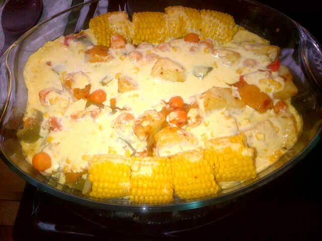 place in oven tray or Pyrex dish.. add cream style corn, fresh cream, and the salt, pepper, lemon pepper,