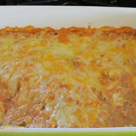 Brown ground beef. Drain excess grease from ground beef. Add refried beans, taco seasoning and water to ground beef. Spread into 9 x13 baking pan.