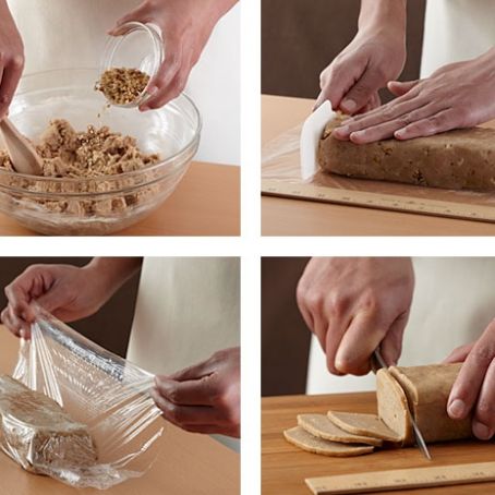 Form into 2 Rolls. cover with plastic wrap and refrigerate overnight. Slice thin and place on a cookie sheet. Bake at 300 for 10 to 12 minutes.