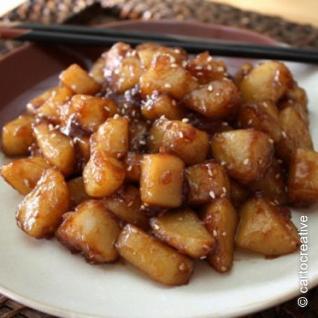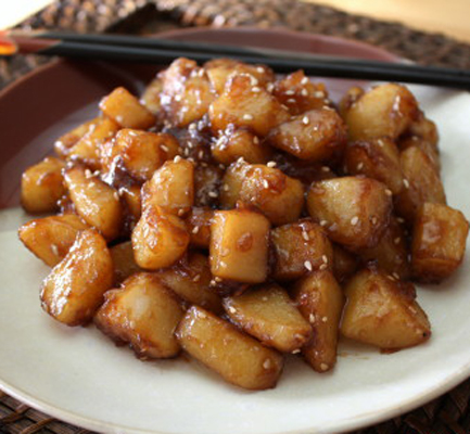 When potato is cooked, remove from stove. Add 1 Tbsp of sesame oil and a sprinkle of sesame seeds.