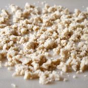 Mix together the sugar a butter. Add the flour and almond flour and work into a dough. Break it up into pea sized pieces on a baking sheet.