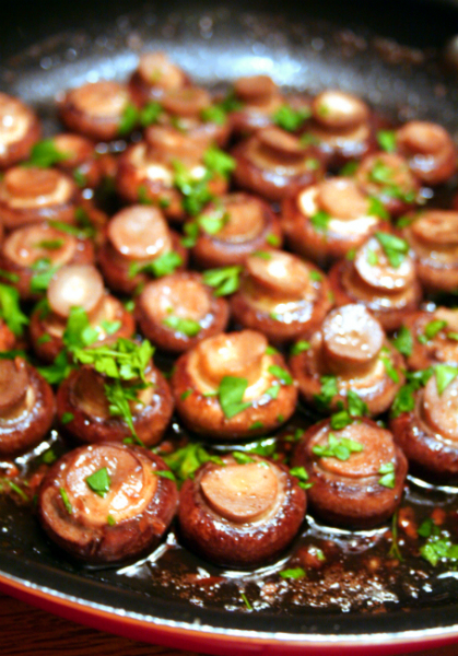 Add in mushrooms and toss to coat with sauce. Cover and simmer on medium-low heat for 15 minutes. Remove lid, season with salt and pepper, and continue cooking on medium-low heat for an additional 5-8 minutes, until the mushrooms are cooked through and the bottoms are golden.