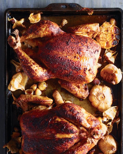 Reduce oven temperature to 400 degrees. Roast chickens for 20 minutes. Remove from oven, and baste with pan juices. Scatter remaining garlic-head halves around chicken; drizzle garlic with remaining 1/4 cup oil, then turn cut side down on sheet. Roast for 10 minutes. Tent birds loosely with foil. Roast until juices run clear and an instant-read thermometer inserted into the thickest part of each thigh reaches 165 degrees, about 30 minutes more. Uncover chickens, and let rest for 10 minutes before serving with roasted garlic.