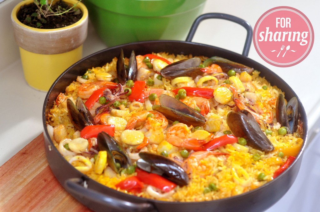 Pour rice mixture into 15x10x2-inch glass baking dish. Arrange chicken, shrimp, squid, clams and mussels in rice mixture. Sprinkle with chopped bacon and peas. Cover with foil.