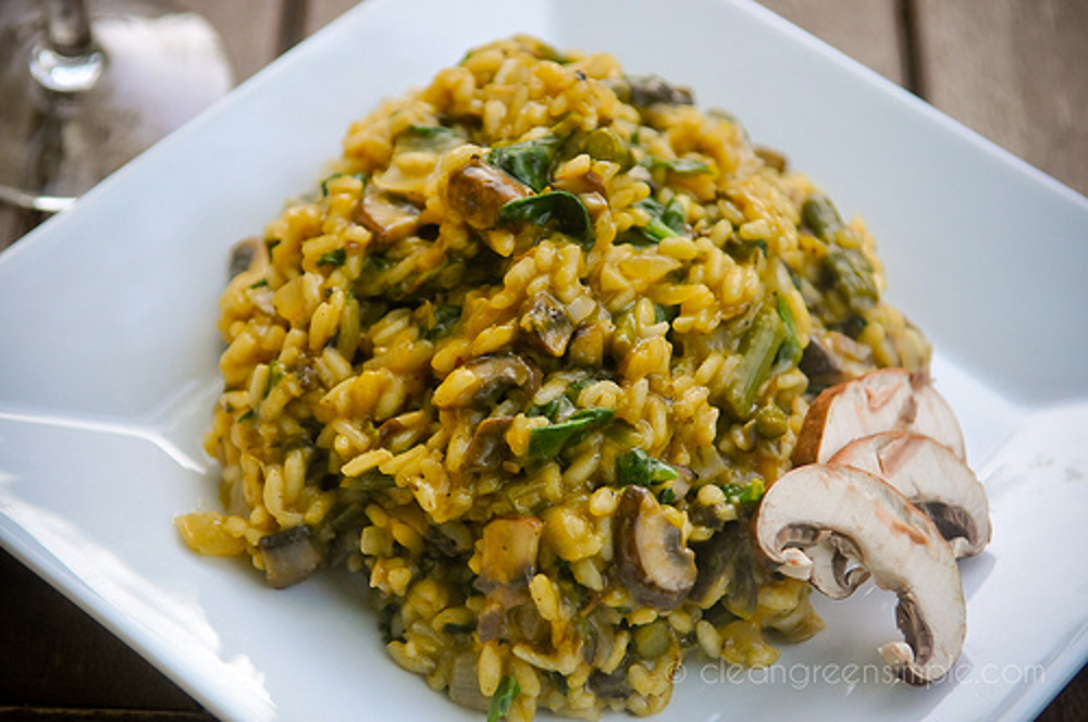 Once you've added almost all the broth, add the spinach, nutritional yeast, onion powder, lemon juice and the rest of the broth and stir until the spinach is wilted - 2-3 minutes. Taste, and add more salt, pepper, or lemon juice if needed. Serve immediately.