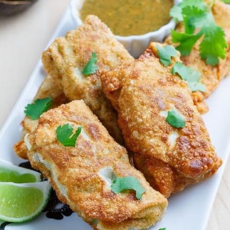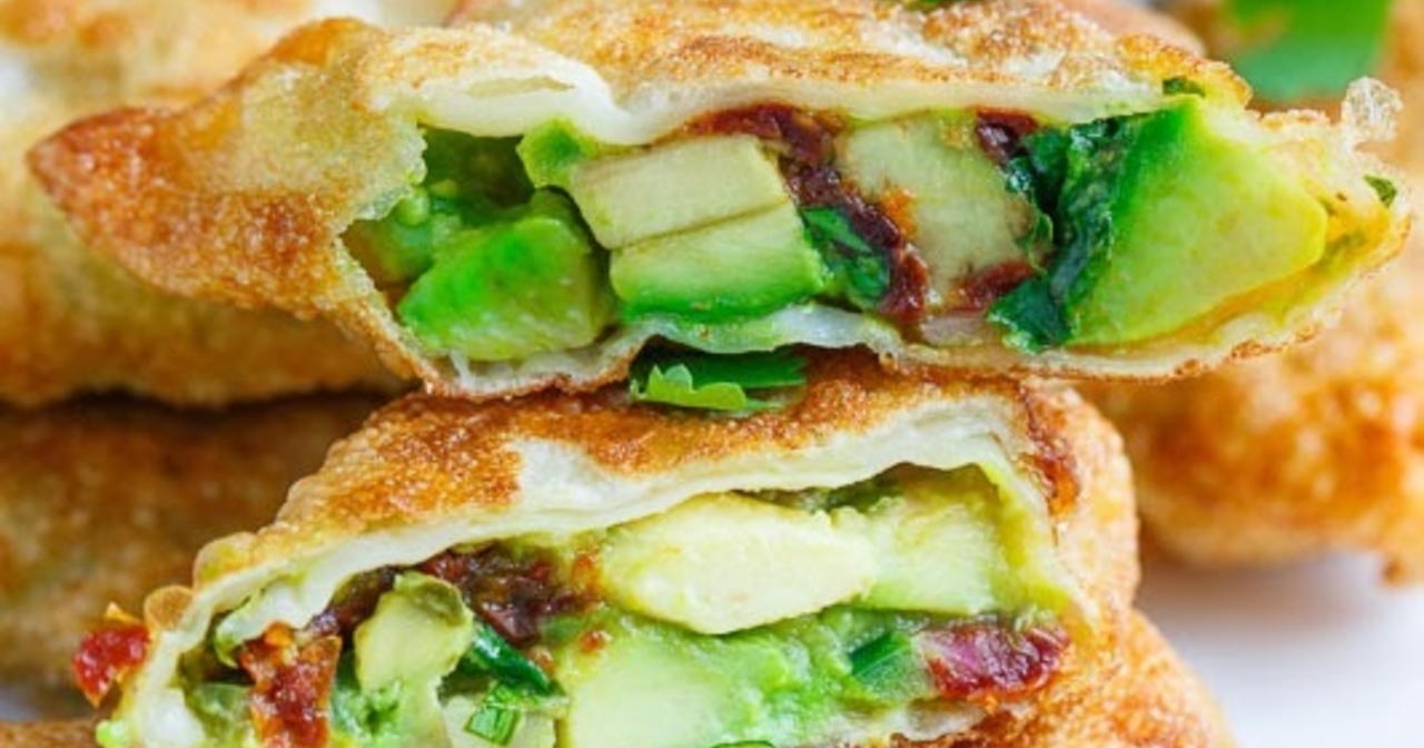 Mix the avocado, sundried tomatoes, red onion cilantro and lime juice, divide the mixture between the egg roll wrappers and roll them sealing with the egg white.
