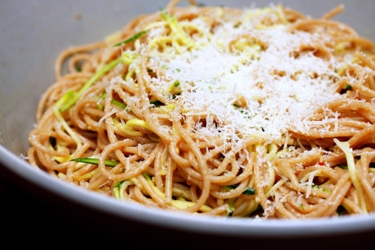 Pour the pasta into a warm serving bowl; add the zucchini, basil oil (optional, recipe below), the garlic mixture, and 1/2 cup of the cheese. Toss well, adding cooking water as needed to make a smooth sauce. Taste for seasoning and add salt and pepper, as needed. Grate about 2 tablespoons Parmesan over the top and serve at once.