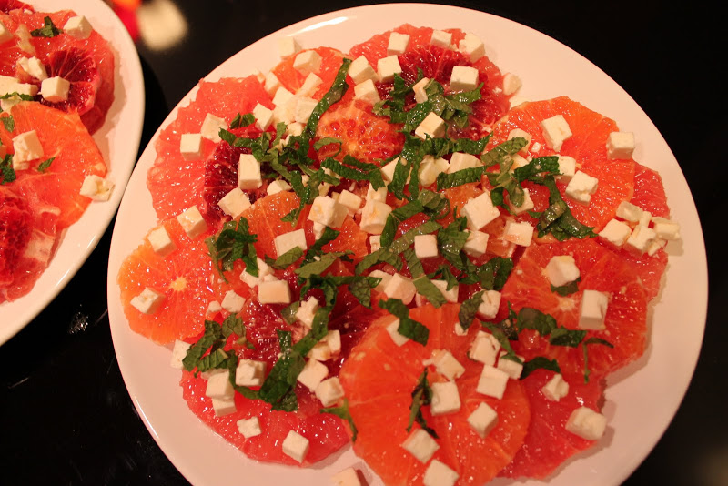 Spread the fruit slices out on a platter. Scoop out the onion bits (a slotted spoon or fork does the trick) and sprinkle them over, leaving the juice in the bowl. Whisk one tablespoon of juice (this is all I had accumulated) with red wine vinegar or lemon juice, Dijon and olive oil. Season with salt and freshly cracked black pepper. Drizzle the dressing over the citrus, sprinkle with feta and mint, adjust salt and pepper to taste, serve immediately and daydream of warmer places.