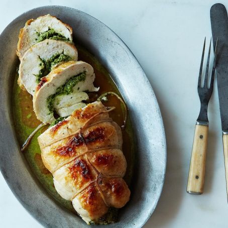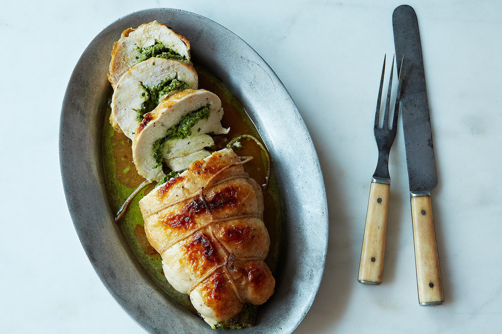 Lay the breast out flat on your cutting board, skin side down. Using a sharp knife, cut some diagonal slashes in the flesh, but don’t slice all the way to the skin. Season with salt and pepper.Spread your filling over the inside of the breast. If you're prepping it from scratch, just pulse the mix -- get creative: think herbs, anchovies, olives or capers, garlic, citrus zests, cheeses, nuts -- in your food processor once or twice, until it's fairly coarse.