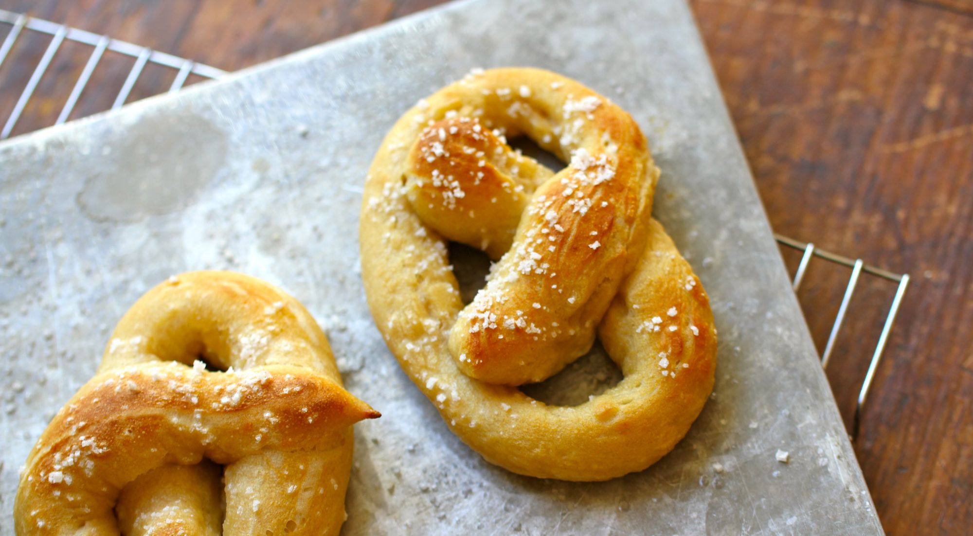 In the meantime, turn the dough out onto a slightly oiled work surface and divide into 8 equal pieces. Roll out each piece of dough into a 24-inch rope. Make a U-shape with the rope, holding the ends of the rope, cross them over each other and press onto the bottom of the U in order to form the shape of a pretzel. Place onto the parchment-lined half sheet pan.