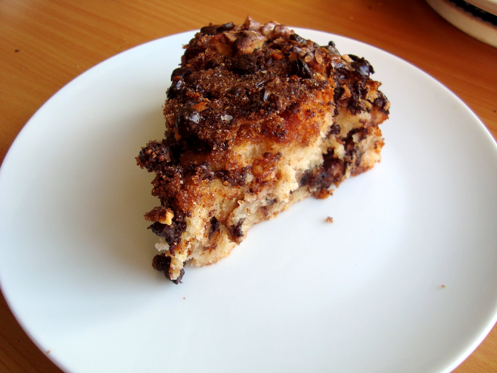 Preheat oven to 350°F. Butter and flour 8x8x2-inch metal baking pan. Stir chocolate chips, brown sugar, walnuts, and cinnamon in small bowl until well blended; set streusel aside. Sift all purpose flour, baking soda, baking powder, and salt into medium bowl. Using electric mixer, beat sugar, room temperature butter, and egg in large bowl until fluffy. Beat in mashed bananas, vanilla and buttermilk. Add dry ingredients and blend well.