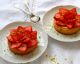 Garnish: Fresh strawberry dipped in yoghurt and then sprinkled with sugar or Stevia. mint leave inserted on a jauntly angle
