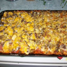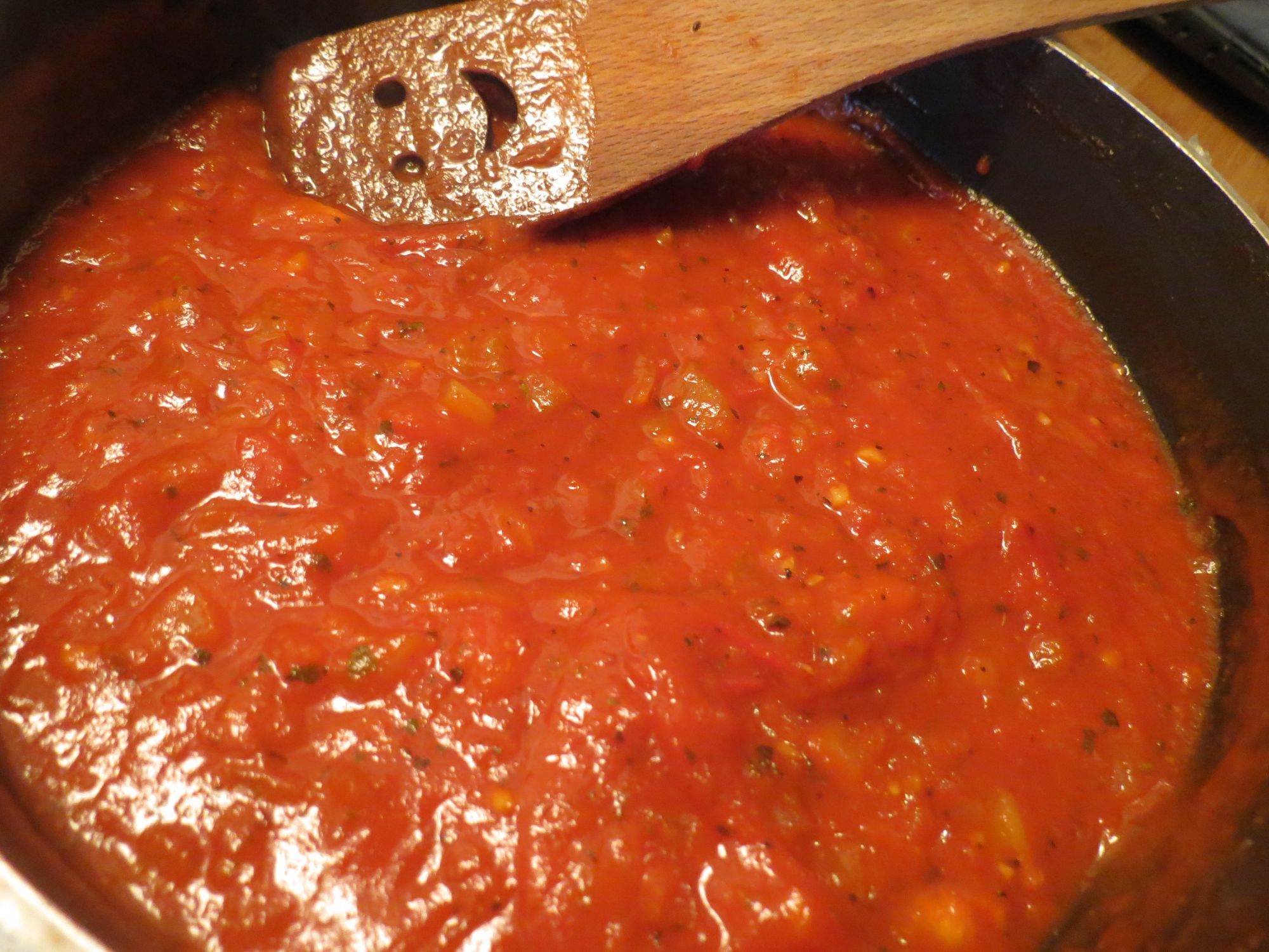 Make a little hole in the center and stir in tomato paste and tomato sauce. / depending how thick you want the sauce to be. Add dried herbs. Stir well and let simmer until all ingredients are blended together. Season to taste with salt, pepper, chili sauce or tabasco.