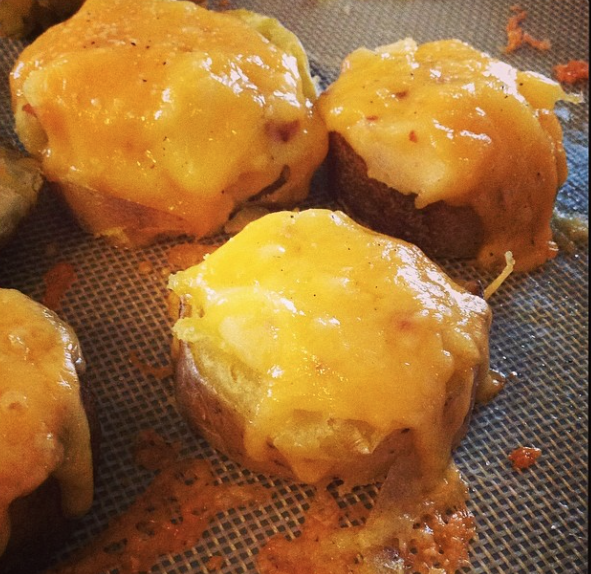 Preheat the oven to 375 degrees. Place the potatoes on a baking sheet and bake for 30 to 35 minutes, or until the potatoes are tender On a cutting board slice the potato into 3 to 4 equal slices. Lay the slices flat and use a round cutter or a spoon to remove most of the insides. Leave a very thin rim of potato around the edge for structure. As you go, dump the insides into a mixing bowl with the butter and sour cream.Add milk and mix the potato mixture together until smooth. Add bacon, seasoned salt, and cheese, and mix together.Use a scoop or spoon to fill the potato slices with the potato mixture. Slightly mound the mixture in the slices, as it will settle after baking. Top with additional cheese if desired, and bake at 375 for 8 minutes, or until the cheese is melted. Turn on the broiler and broil for 3 to 4 minutes, watching very carefully so you won't burn them. Remove from oven and let sit on the baking sheet for at least 10 minutes before removing with a spatula and serving.