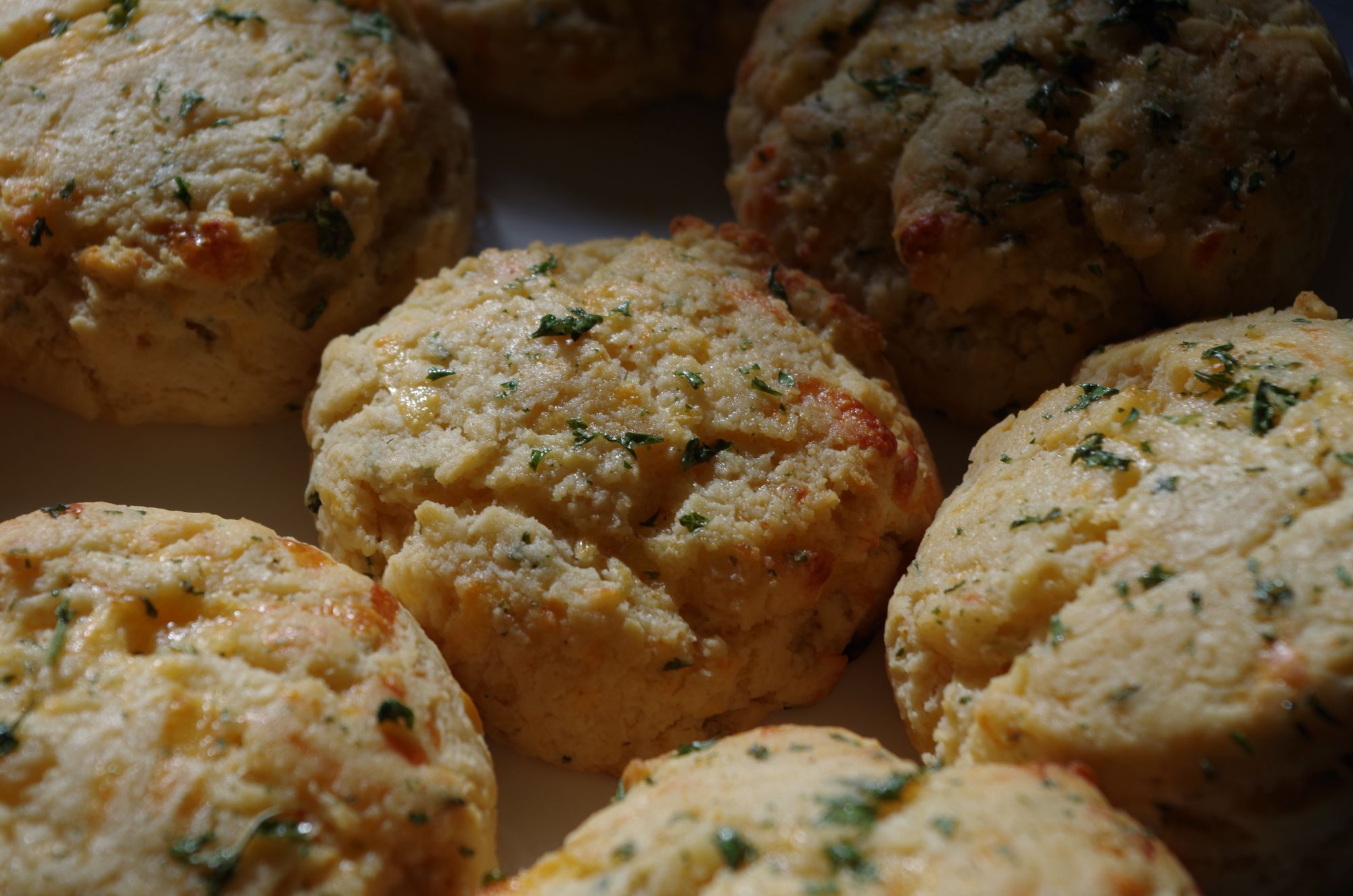 Preheat oven to 450 degrees. Line a baking sheet with parchment paper and set aside. In a large mixing bowl, combine flour, sugar, garlic powder, and salt. Whisk together the melted butter and buttermilk. Combine with the dry ingredients until incorporated. It will make a thick dough. Fold in the cheddar cheese. Measure out each biscuit in a ¼ cup measuring cup. The measuring cup worked great for packing the dough into the cup and spooning the dough out onto the baking sheet. It made perfect round biscuits. Bake for 10-12 minutes in preheated oven until golden brown. Combine garlic butter topping ingredients and brush onto each biscuit. Makes 11 biscuits.