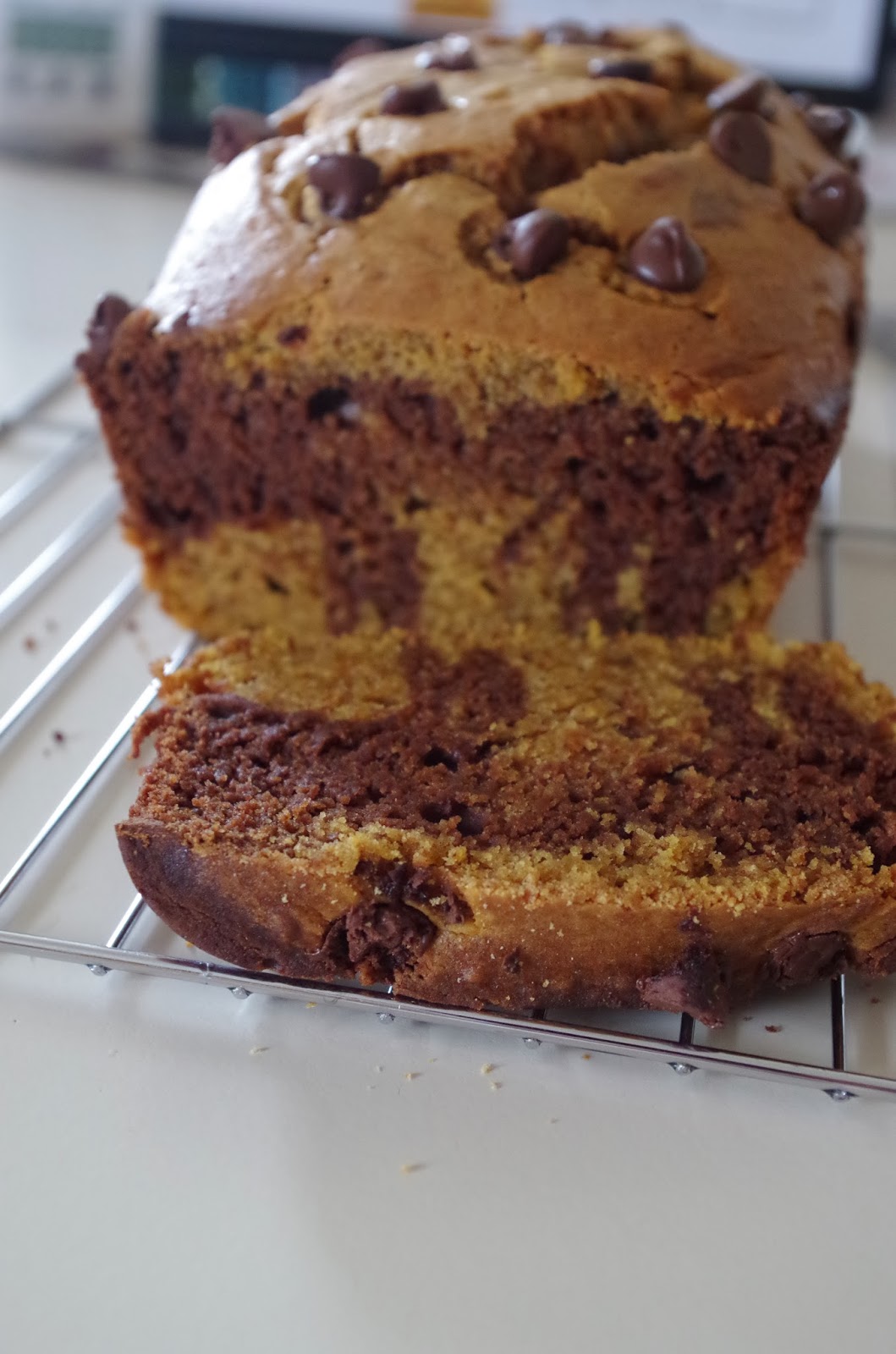 Adjust oven rack to middle position and preheat oven to 350°F. Line an 8- by 4-inch loaf pan with parchment paper, allowing edges to overhang. Grease unlined part of pan. Whisk sugar, oil, pumpkin, eggs, pumpkin, and salt in a large bowl until combined. Add flour, baking soda, cinnamon, nutmeg, and clove to the batter, and then whisk until completely combined. Spoon 2 cups batter into pan. Spoon 1 cup batter into measuring cup and reserve. Whisk cocoa and milk into remaining batter and spoon into pan. Using a butter knife or small offset spatula, swirl the batter a few times, lifting pumpkin batter from the bottom. Then spoon reserved pumpkin batter over the top and swirl a few times more (see note). Bake until top is just set and skewer inserted into the center comes out with moist crumbs, 60 to 75 minutes. Let cool in pan 45 minutes, then transfer to wire rack to cool completely.