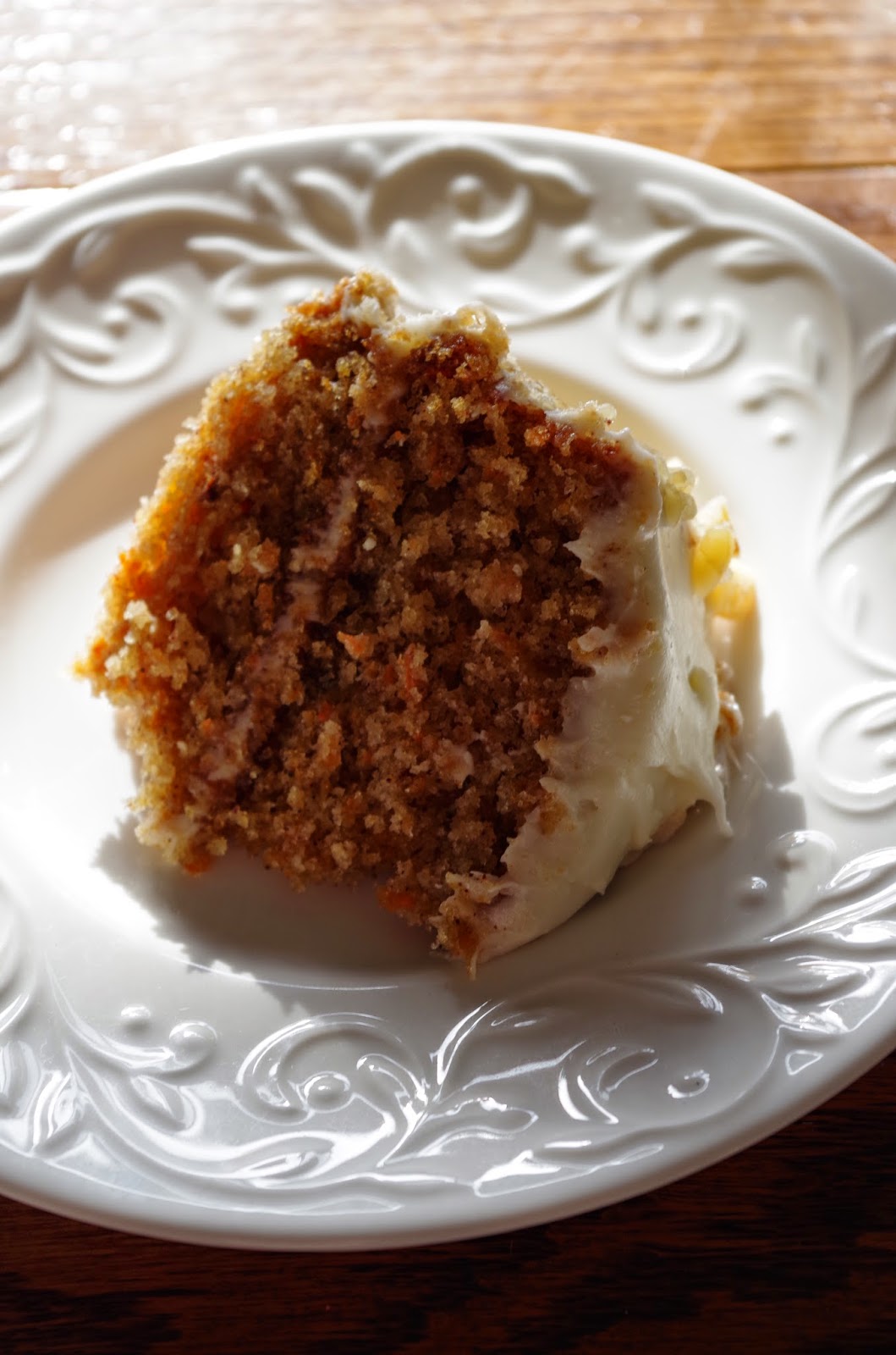 Preheat oven to 350F. Prepare two 8 or 9-inch round cake pans by spraying them lightly with pam. Cut out circles of parchment paper to lay inside the pans and give them a light spray as well. In a medium bowl, sift together flour, baking soda, cinnamon, nutmeg, cloves and salt. Add carrots and mix with a spoon to combine. Set aside. In a large bowl using a hand mixer, mix together sugars and eggs until combined and pale in color. Add oil and continue to mix until oil has incorporated into the eggs and sugar. Add dry ingredients and mix on the lowest speed until just combined. Divide batter equally between the two pans and bake for approximately 40 minutes, or until a toothpick comes out clean. Let cake cool in pan for 2 hours. To remove, carefully run a paring knife around the perimeter of the cakes and invert onto a cooling rack or plate. Make sure the cake is completely cooled before frosting. To make frosting, beat together cream cheese and butter with an electric mixer until well combined. Add sour cream and vanilla. Slowly incorporate powdered sugar and mix until smooth and creamy. Decorate cake as desired. I covered the outside of the cake with chopped walnuts.