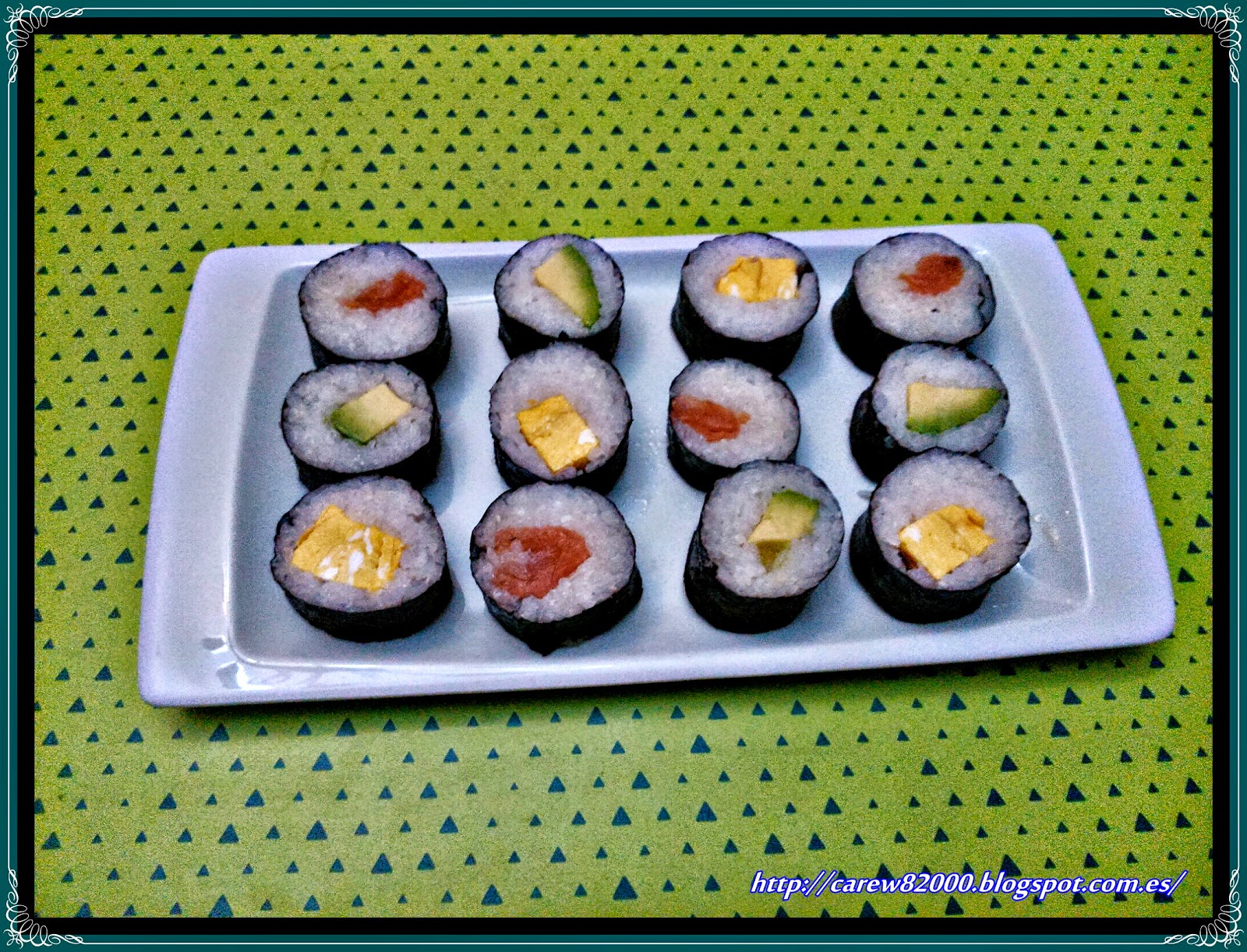 Put water on to boil with a little salt, and when it begins to boil pour the rice, and cook about 20 minutes or so, past the cooking time you drain it, let it cool without using cold water and add a tablespoon tablespoon rice vinegar if you have not got, mix white vinegar with a little sugar until it dissolves well and mix with rice letting it cool down. Peel and cut into strips avocado and salmon, and prepare an omelet with two eggs and cut into strips also can replace these ingredients with others that you like most.
