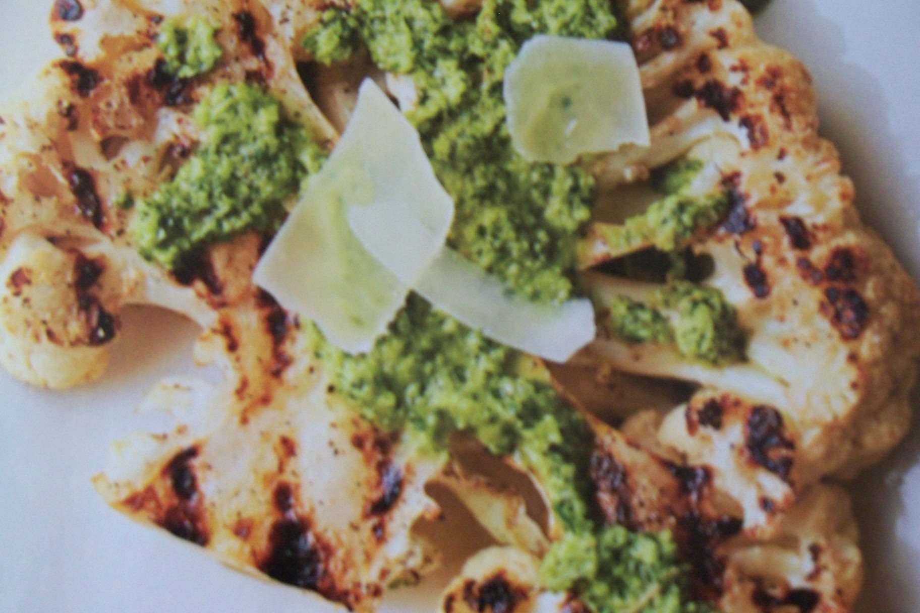 In food processor, combine parsley, jalapeno, garlic, lime juice, 2 TBS olive oil and 1/8 tsp salt. Process 1 minute. Preheat oven to 420 deg. Remove and discard cauliflower leaves, rinse head under running water. With stem up, slice through head on both sides of stem, leaving a 2 inch section that has the stem attached. Save florets without stem for another use. Cut center section into 2 steaks about an inch wide.