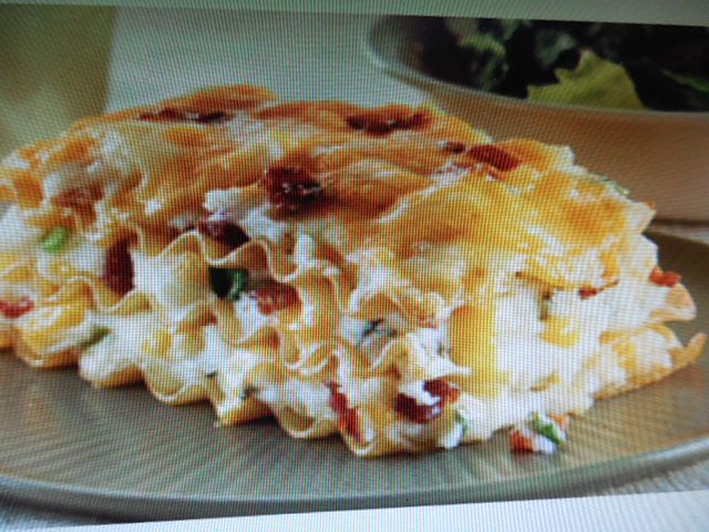 Place 3 noodles in 9x13 inch baking dish sprayed with cooking spray. Cover with 1/2 of the potato mixture. Repeat layers twice. Top with cheddar and cover.